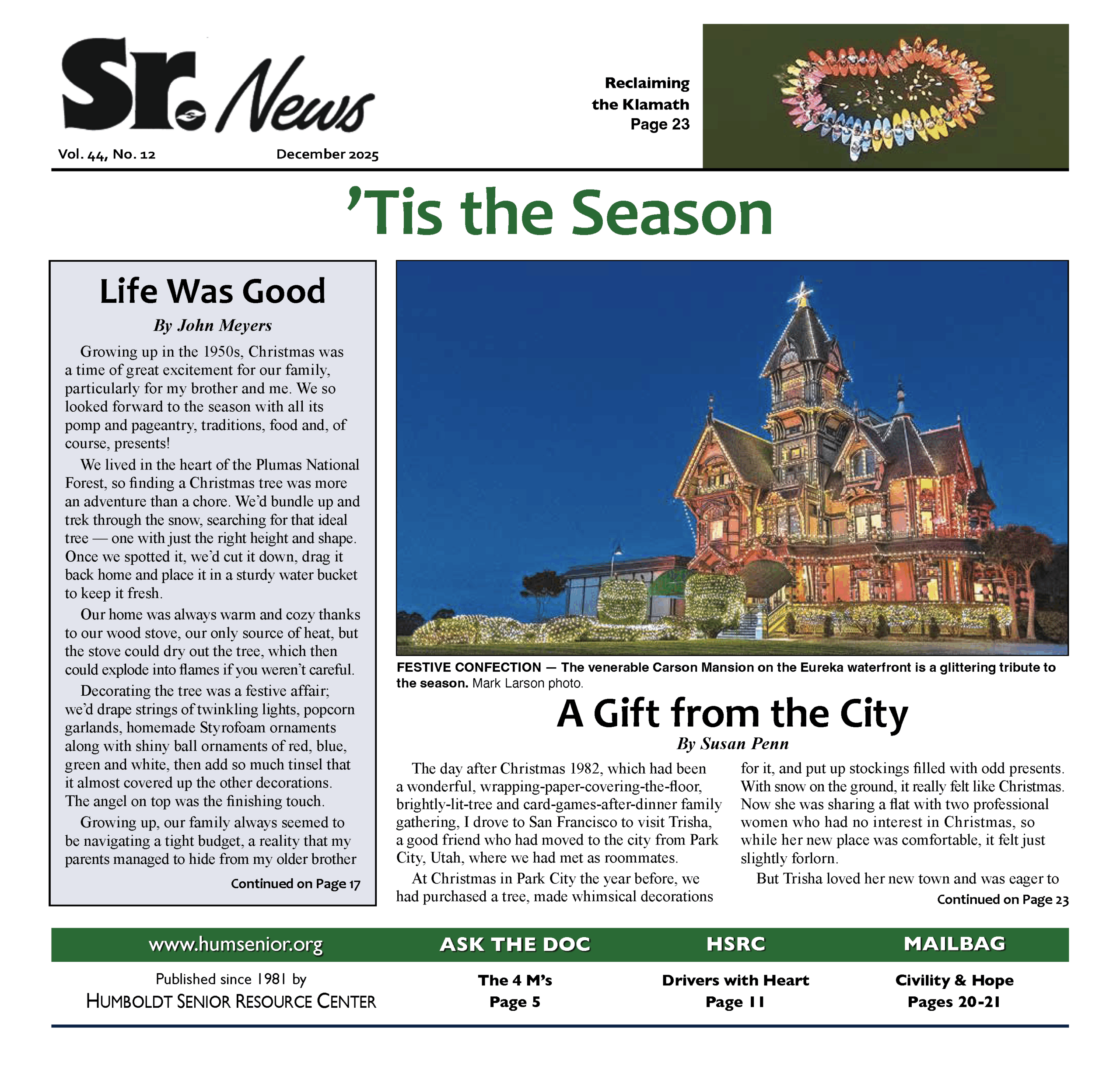 ’Tis the Season to bid farewell to another year and to dust off the reindeer, tinsel and other festive whatnot for the holidays. Senior News, the free monthly community newspaper from the Humboldt Senior Resource Center (HSRC), celebrates the season with a collection of festive tales of holidays past, present and future.