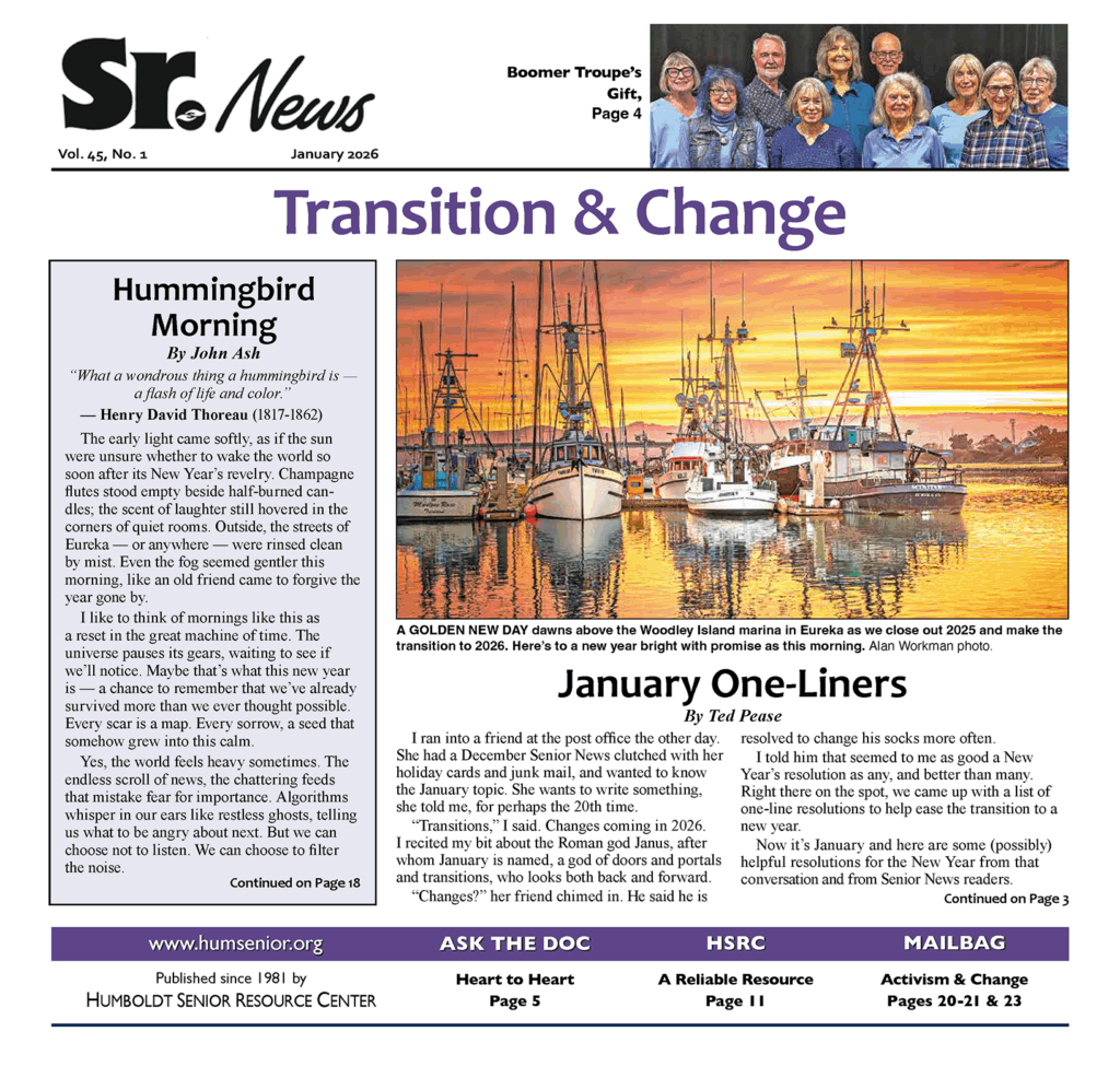 Never miss an issue! You can have Senior News mailed directly to you for $36 annually (12 issues). To pay by credit card, call 707-443-9747. Checks can be mailed to HSRC, 1910 California St, Eureka CA 95501.