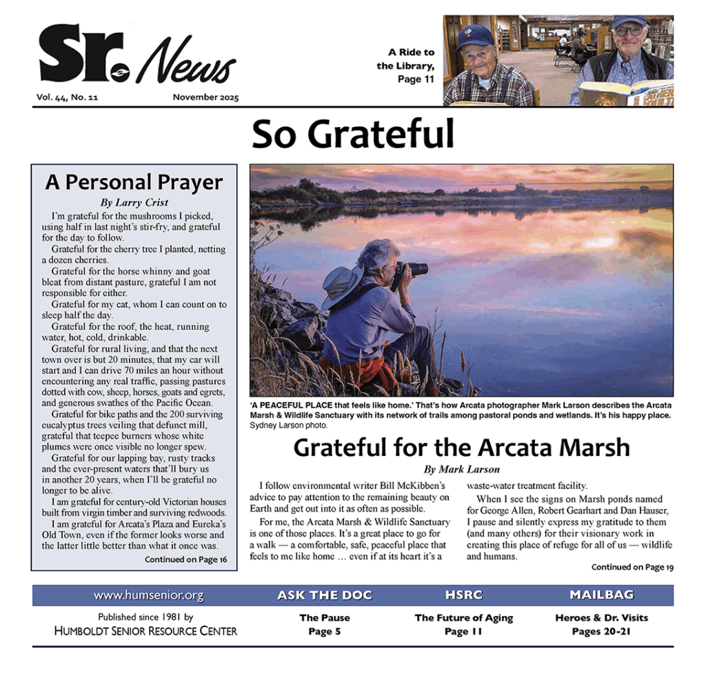 Never miss an issue! You can have Senior News mailed directly to you for $36 annually (12 issues). To pay by credit card, call 707-443-9747. Checks can be mailed to HSRC, 1910 California St, Eureka CA 95501.